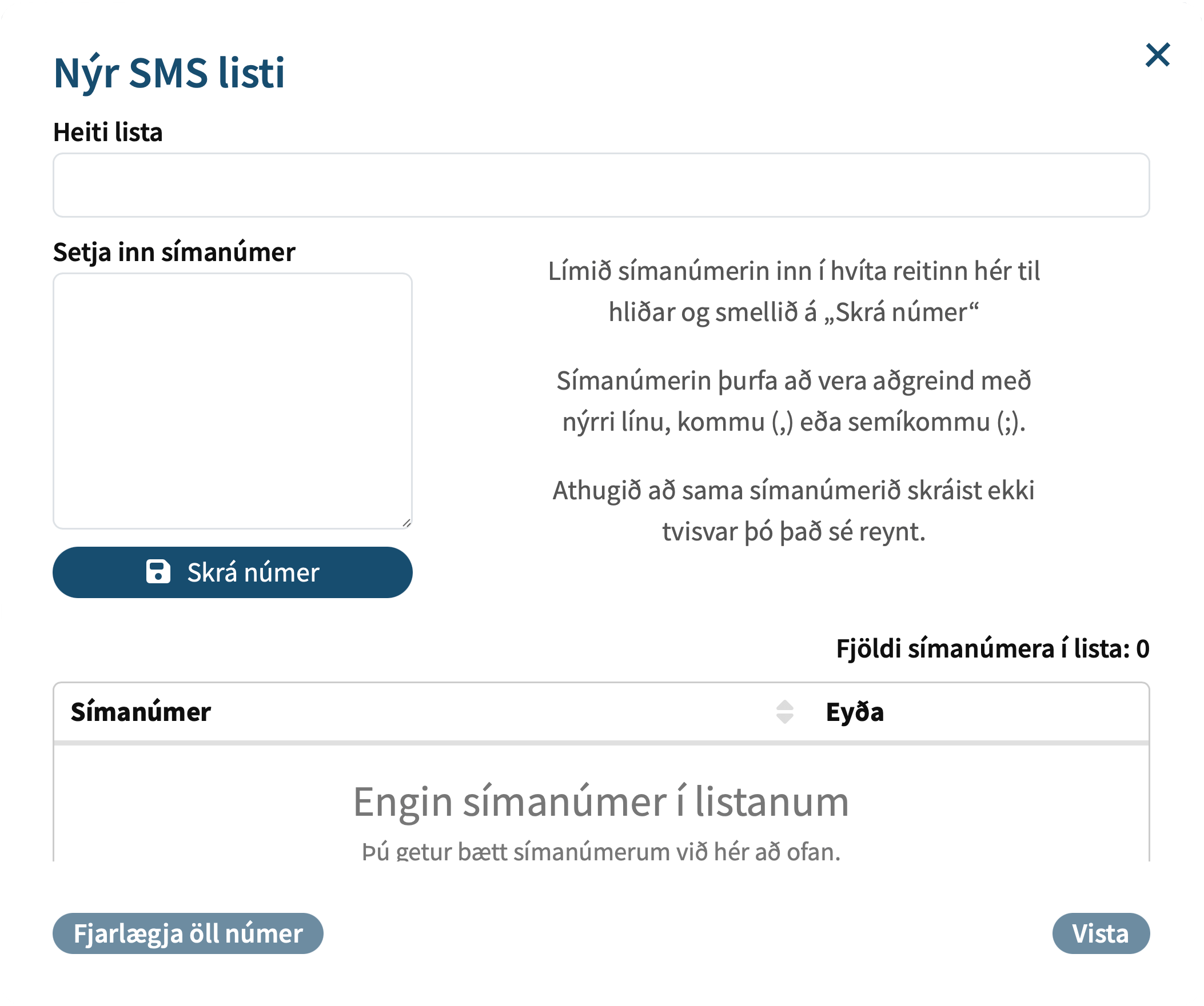 Í SMS gáttinni getur þú vistað lista af símanúmerum, s.s. símanúmer félagsmanna, viðskiptavina eða annarra og sent skilaboð til allra í einu.
