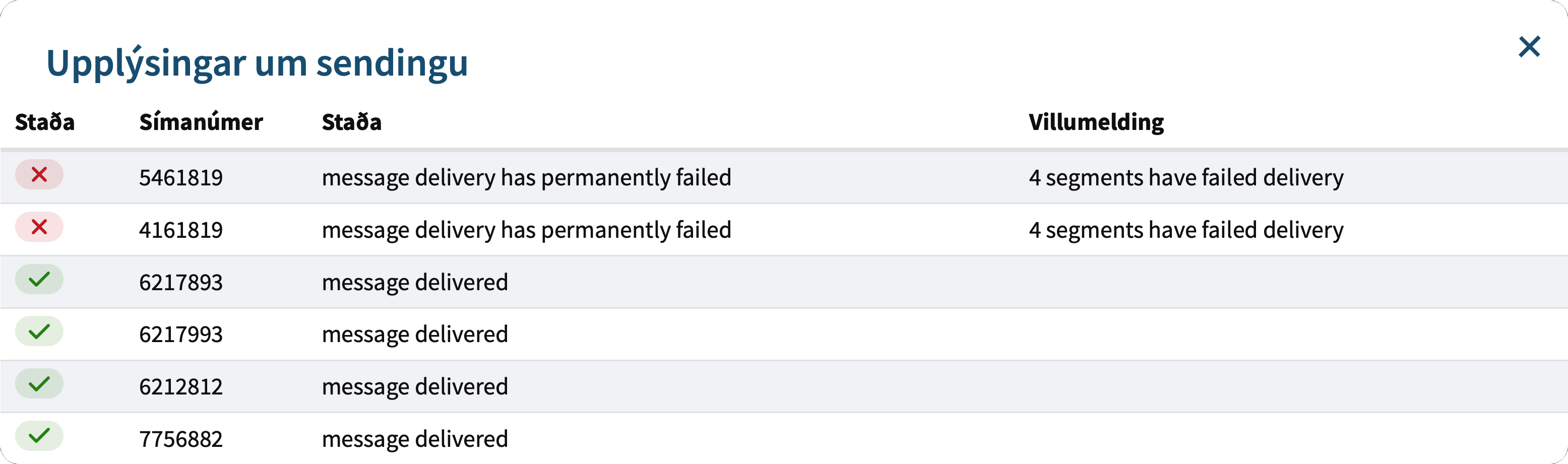 Þú getur síðan séð stöðu sendingarinnar. Hver fékk SMS-ið og hver ekki.