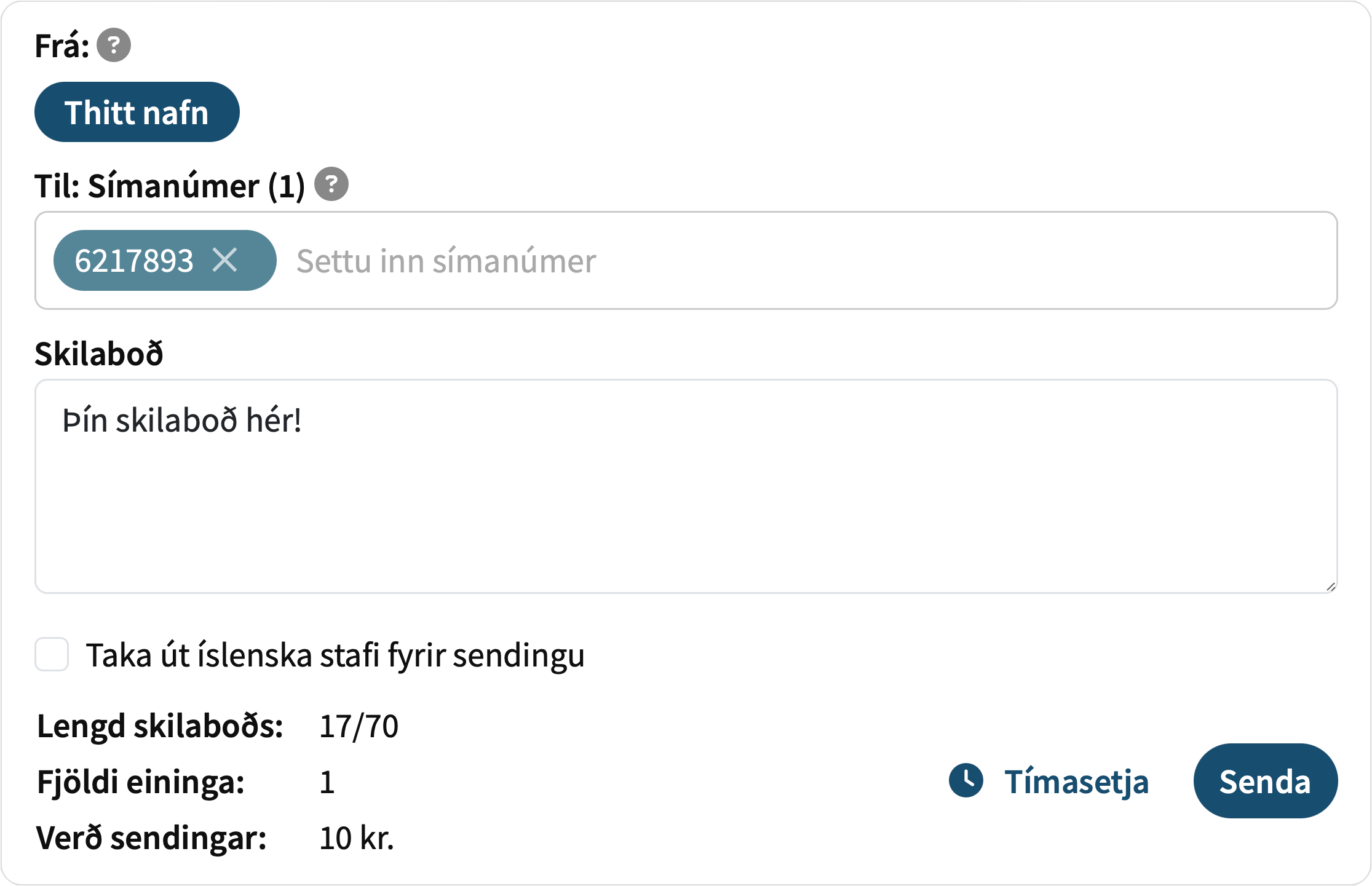 Athugið að samkvæmt fjarskiptalögum er einungis heimilt að senda fjöldaskilaboð til þeirra sem hafa samþykkt að fá slík skilaboð. Sem þýðir að hver og einn viðtakandi þarf að hafa veitt þínu fyrirtæki samþykki sitt til að leyfilegt sé að senda á hann skilaboð.