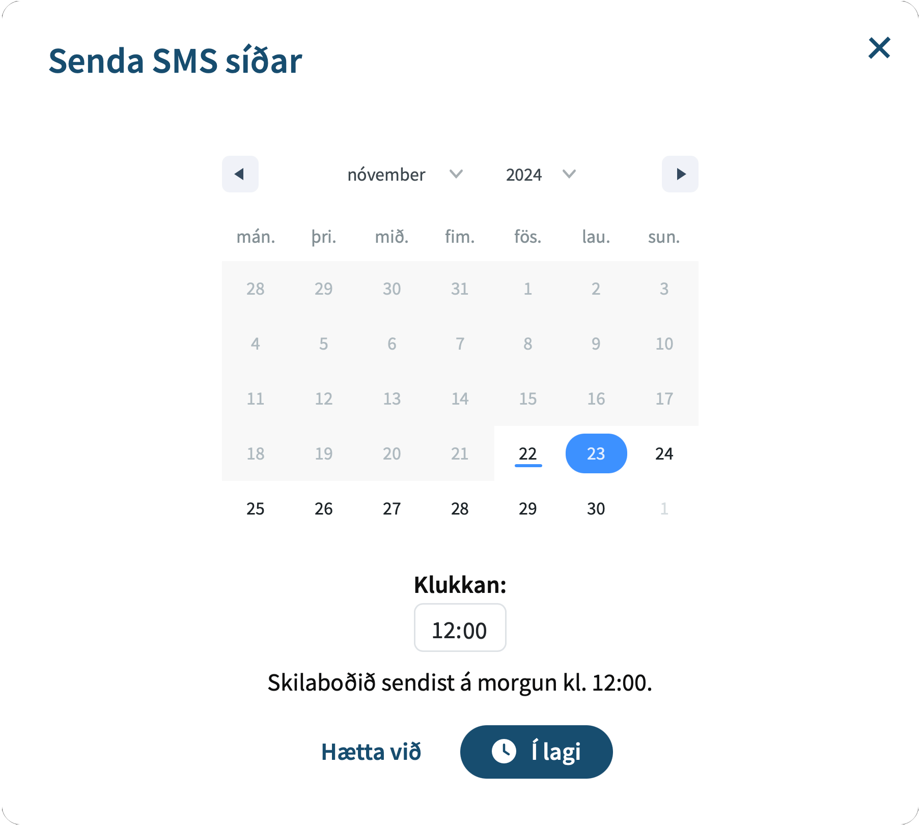 Í SMS gáttinni getur þú tímastillt skilaboðin þannig að þau skili sér í síma viðskiptavinarins á hádegi daginn áður.